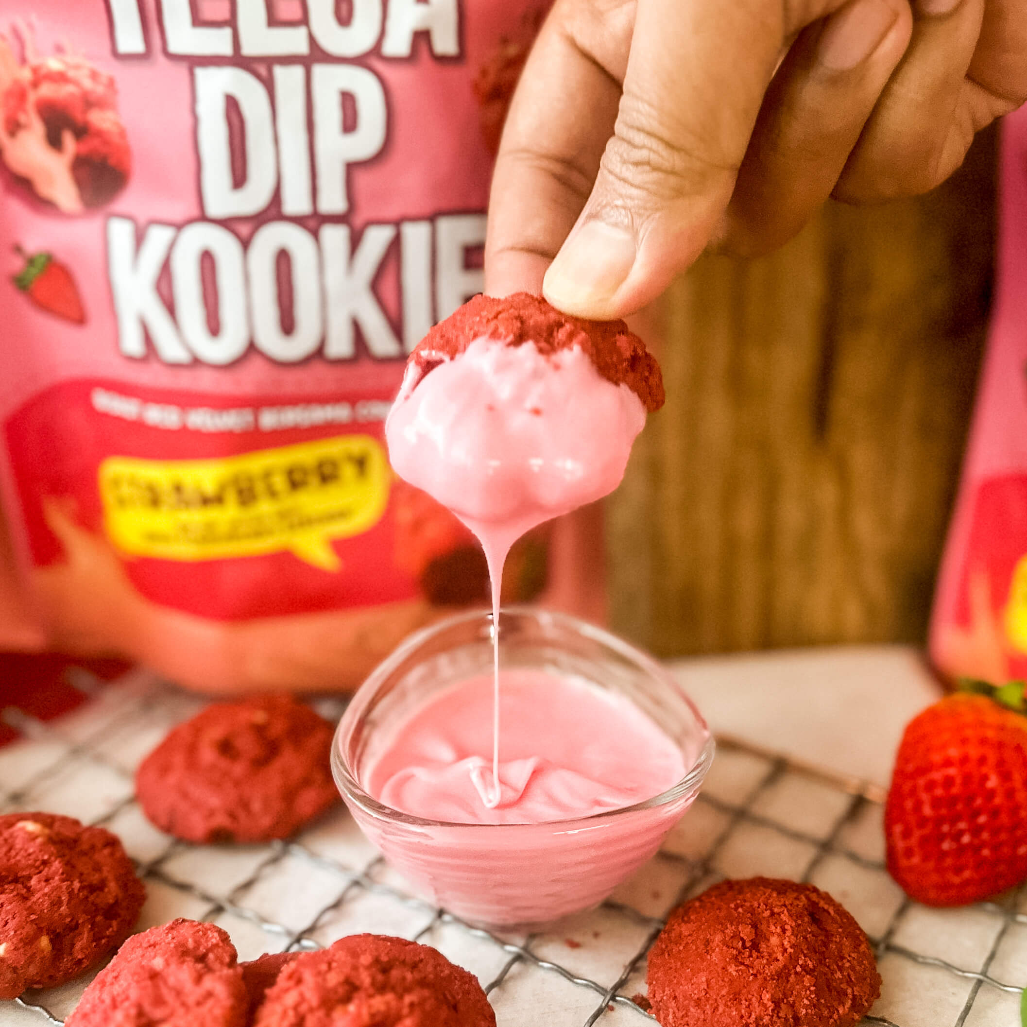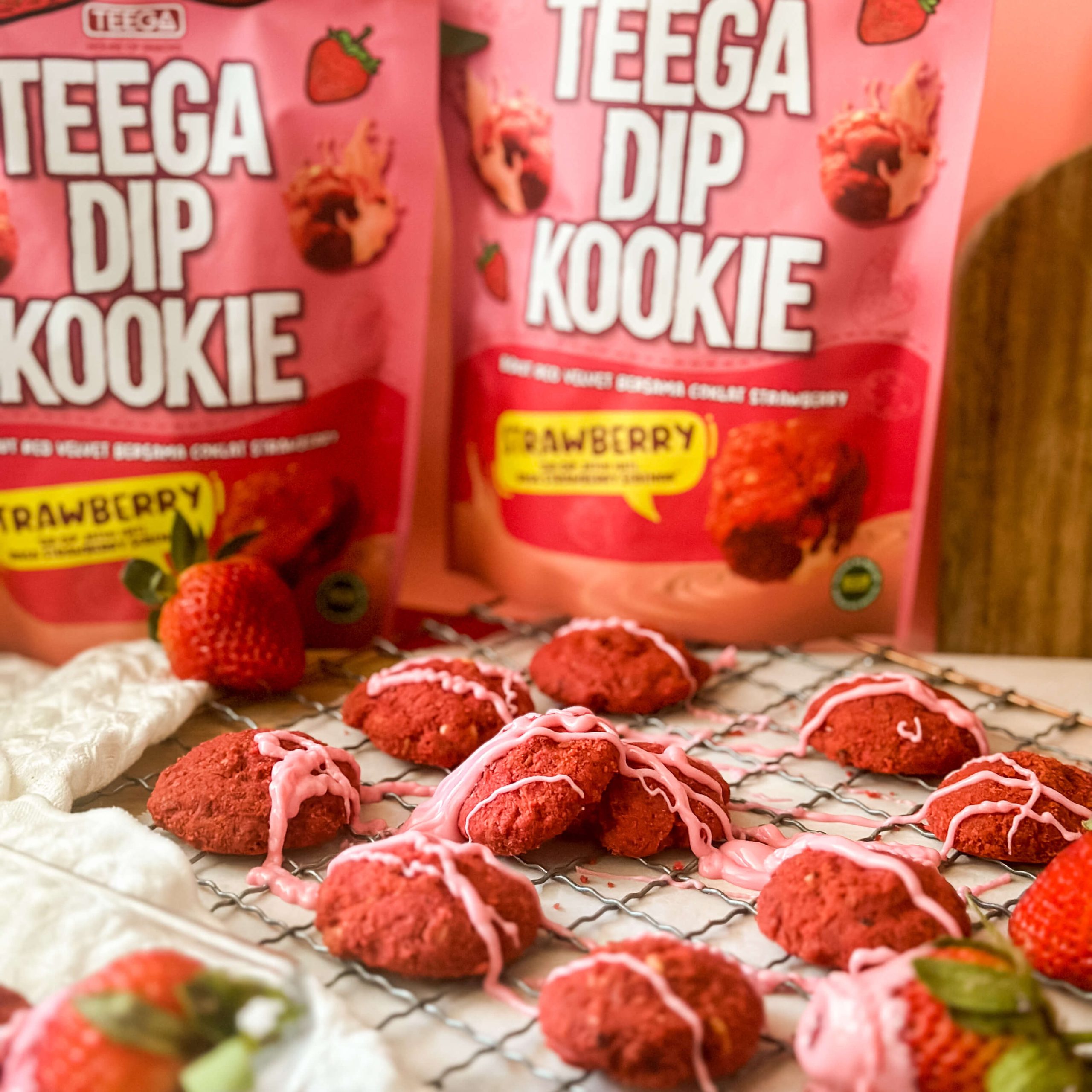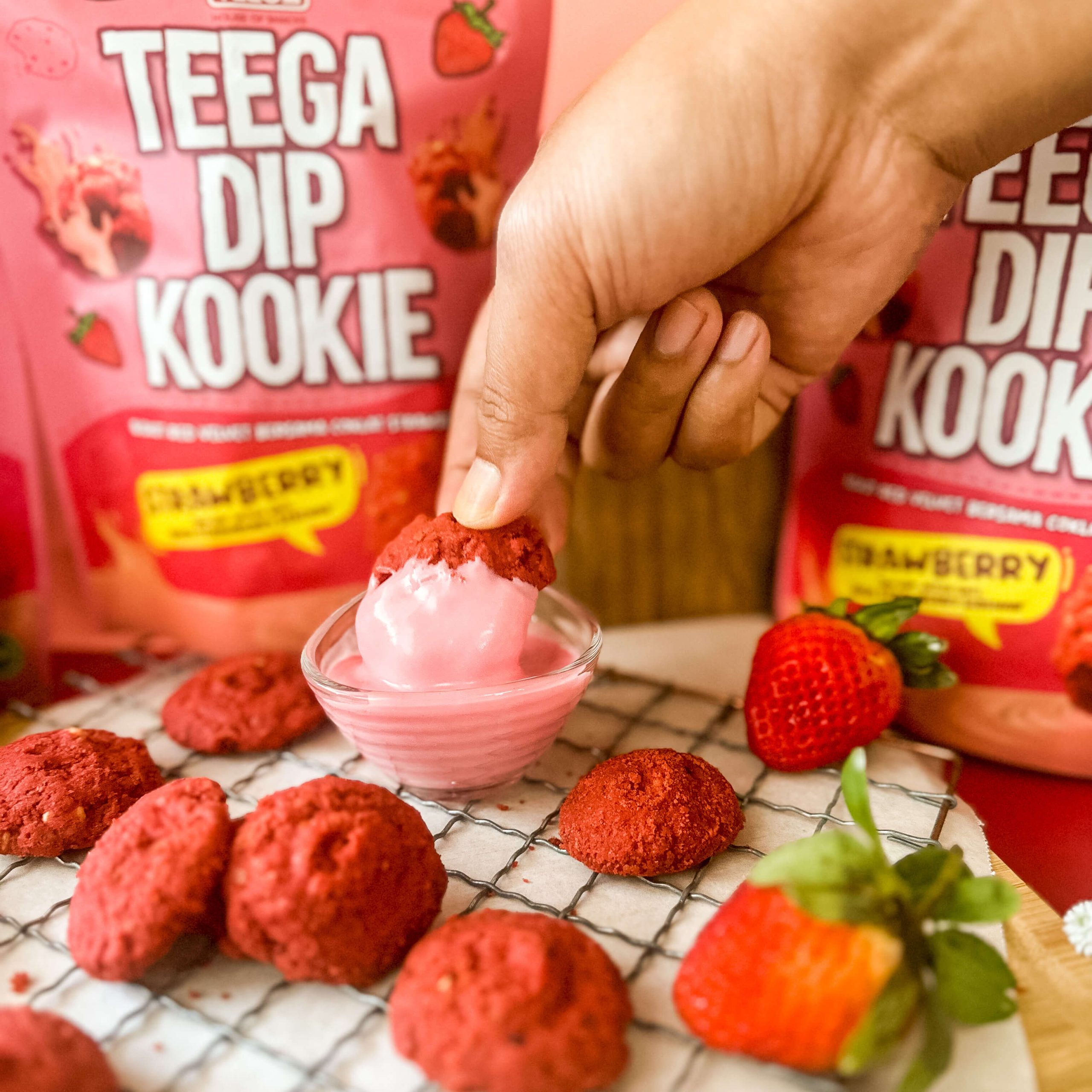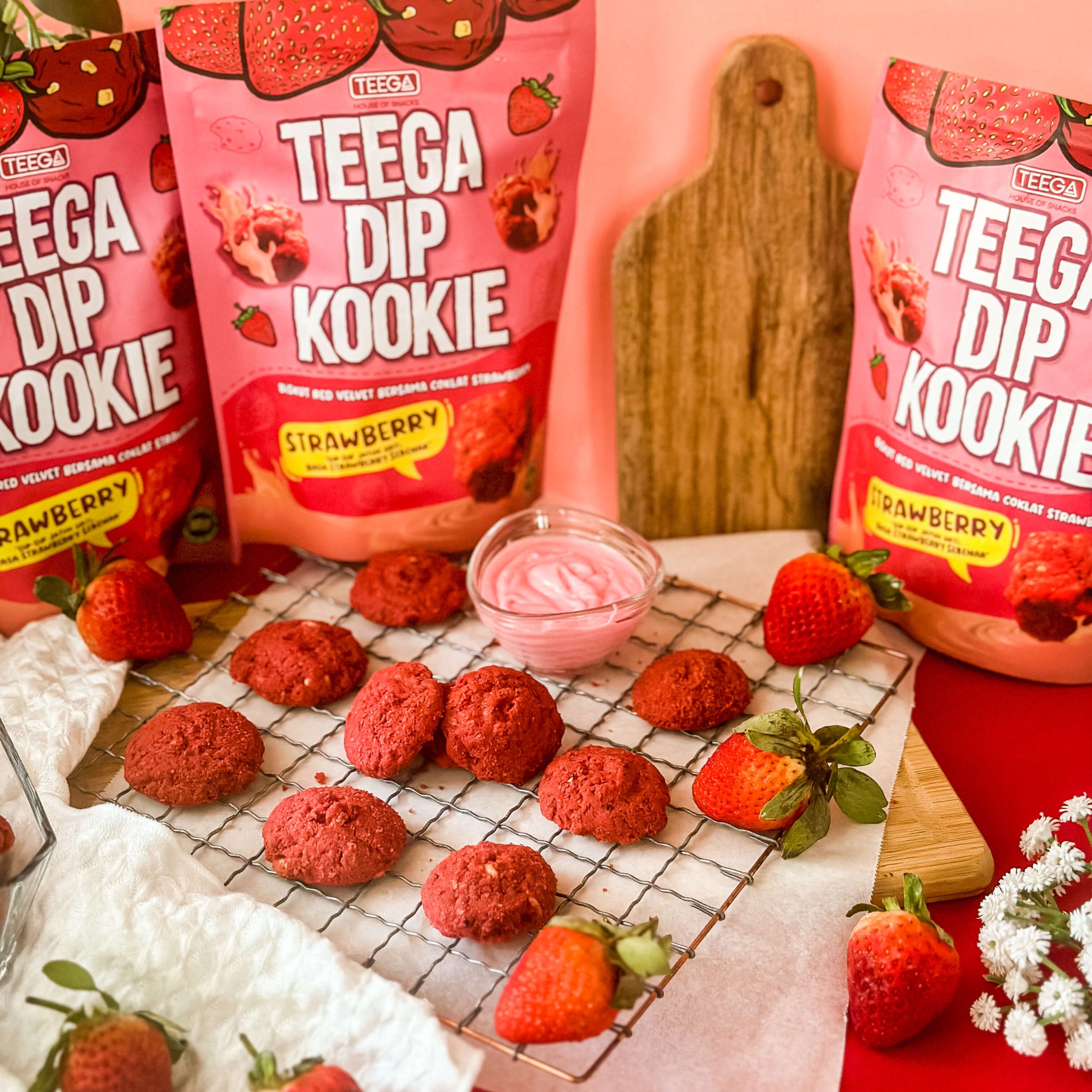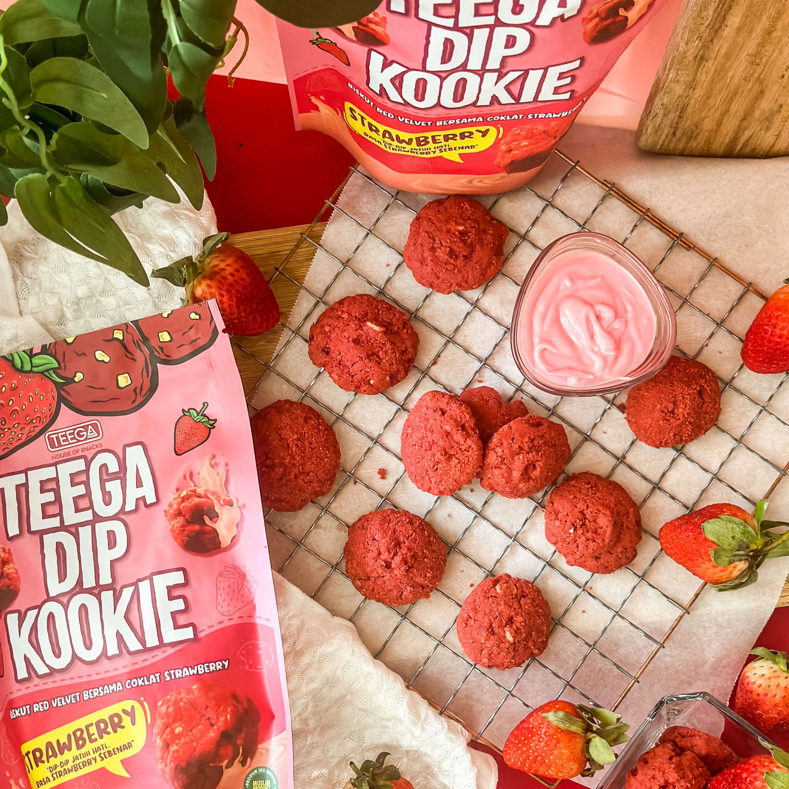 Jadi di Teega ada Strawberry ke tidak? Mesti ada ye kome kome semua. Kita ada Dip Kookie Strawberry! Rasa Dip Strawberry tu sangat terliur, cair dalam mulut dengan bau strawberry yang wangi. Adduh buat admin terliur pula hahaha. Bukan setakat Dip je strawberry, Kookie kita pun strawberry!
